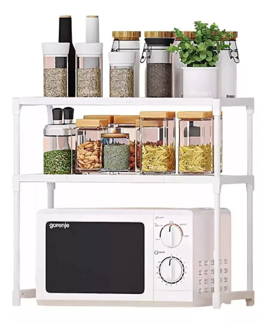 - Este estante para microondas de cocina puede ampliar el espacio de almacenamiento de sus armarios, lo que permite que sus armarios para acomodar más electrodomésticos de cocina. Es adecuado para los hornos de microondas utilizados por la mayoría de las familias. El espacio adicional se puede utilizar para colocar su freidora, cafetera, panadería y jarras de especias.