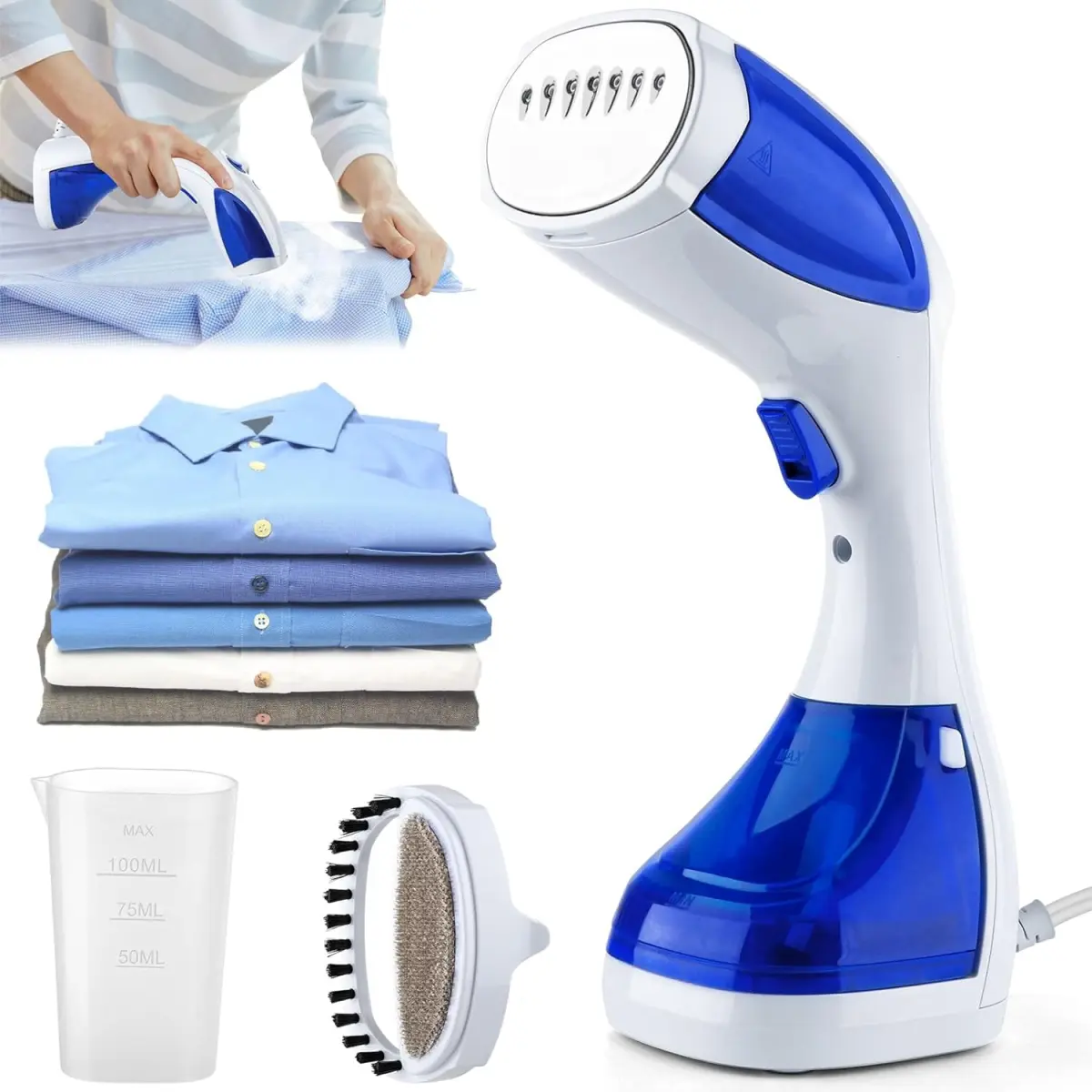 - Después de presionar el botón de vapor, la plancha de viaje siempre producirá vapor, lo que es conveniente para tus necesidades de planchado a largo plazo. El vapor de alta presión puede eliminar rápidamente las arrugas en la ropa, manteniendo tu ropa hermosa y limpia. El vaporizador de prendas contiene un cepillo, que puede eliminar las impurezas de la ropa durante el planchado. Es adecuado para diferentes telas como seda, algodón, lino y gasa. Pequeño y portátil, adecuado para personas de negocios, familias y viajes.